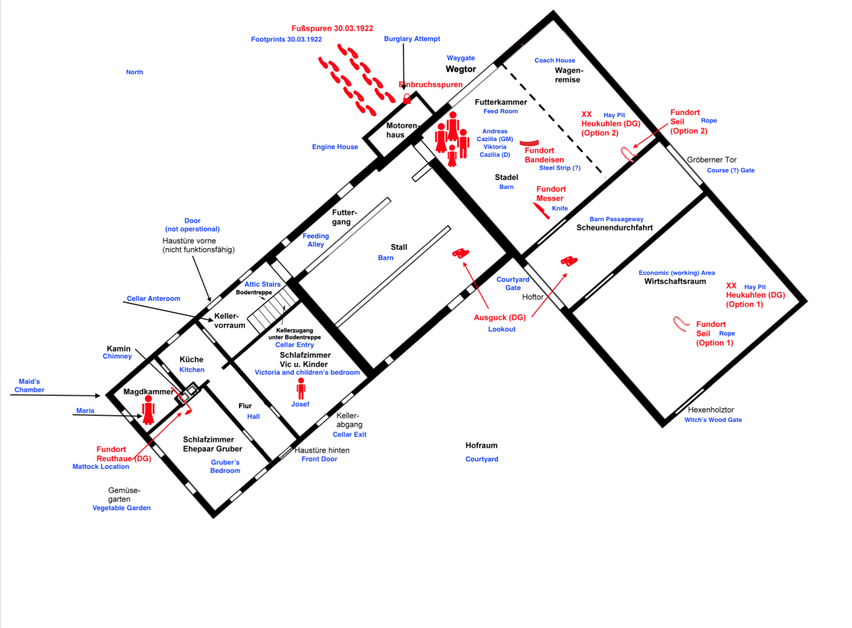 Sidenote: for Lorenz to have reached the cow and led it back into the stable he would have had to practically walk over the victim’s bodies. In his first statement he even mentions his stumbling against the door and ignoring it, whilst Michael chose to look closer. Also, some sources say that Lorenz’s actions whilst moving through the crime scene are a little suspicious; firstly, it as if he is deliberately messing with any potential evidence and secondly, he seems to know a lot about the layout of the house.