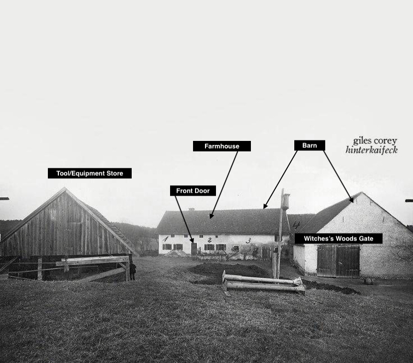 The three men approach the farmhouse at the north side which seems to be where the kitchen door is situated (according to Jakob’s statement) but instead of going to the front door, which Jakob says he was expecting, Lorenz leads them through the courtyard and up to the gate of the barn passageway. Now here Jakob questions Lorenz as he doesn’t think they’ll be able to access the main house this way, however Lorenz merely insists they follow him and pushes open the gate. Whether this is the gate that the two boys had attempted to push on when they had visited only an hour or so previously is unclear but for now we assume that it had been locked until recently.