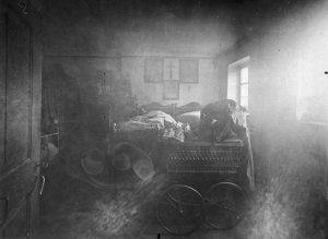 Once inside the house Jakob immediately goes to open the door to his right, which leads to Viktoria’s and her children’s bedroom. Pushing the doorknob down he leans against the door but it doesn’t budge, this is when Lorenz advises him that you have to lift it as it ‘operates from the bottom up’. Once open the three men enter the bedroom, their gaze pretty much straight away falling upon the bassinet; the hood of the bassinet is pulled up but almost completely destroyed as if something heavy has passed through it. Inside they find the body of little Josef Gruber. Looking around the rest of the room they notice that drawers of the children’s clothes are on the beds along with their ‘savings banks’, which we presume to be piggy banks or savings books, and also a wallet. Although this was all lying on the beds Jakob would later note that nothing looked ‘disordered’. In fact, it looked almost as if someone had been organising the clothes, doing the laundry or maybe packing them?